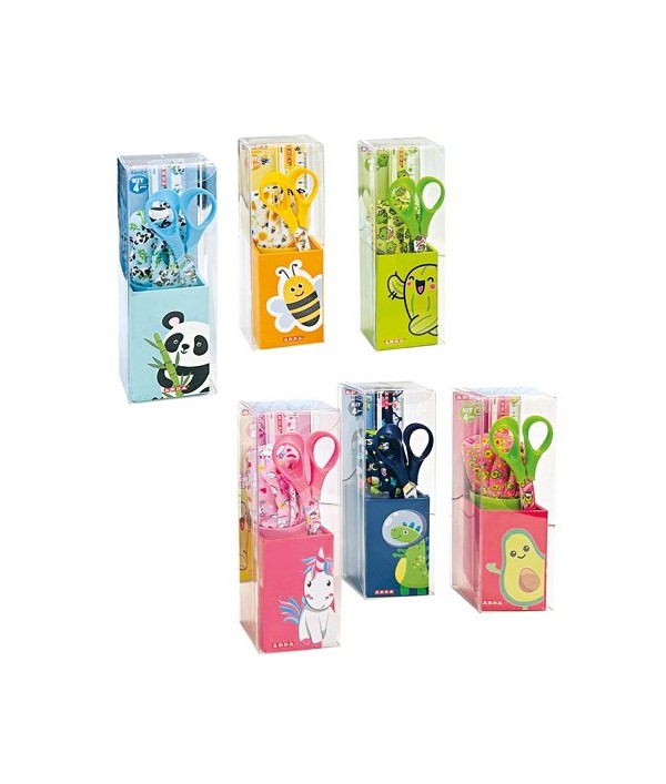 KIT SCUOLA FANCY righello 16cm, forbice ARDA 319FANSC temperino 3F, bicchiere in confezione trasparente